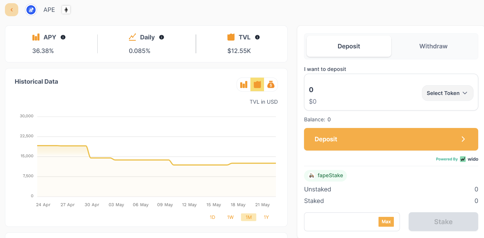 For this example we are going to select the $APE coin farm from the list which will switch views into the dashboard, showing various statistics for this farm, and the convert/revert buttons.