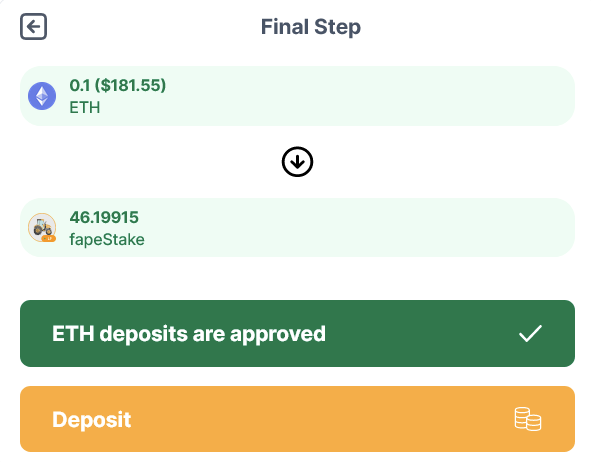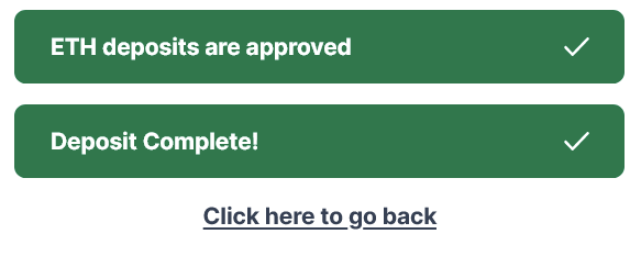 Congratulations, you successfully swapped from ETH into the asset needed for fToken converting! But now you need to stake those assets into Harvest to receive additional rewards. Click on 'Click here to go back' so we can finalize your convert by staking your assets.